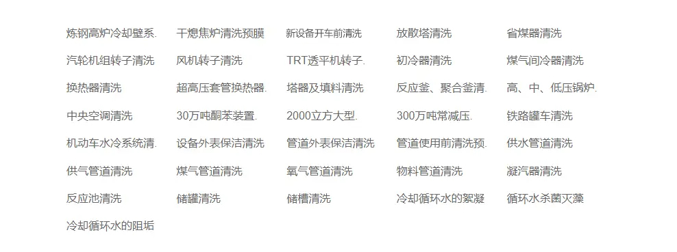 公司专业从事各种工业设备清洗和工业冷却循环水质稳定工程,我公司承接各种工业设备清洗工程及冷却循环水的缓蚀阻垢、杀菌灭藻等水质的稳定工程